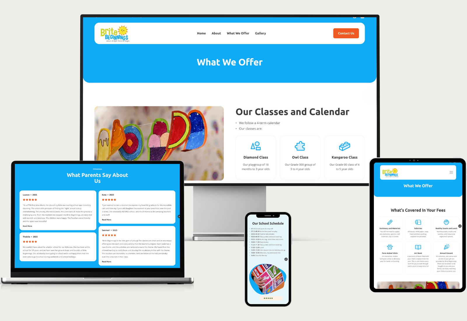 Brite Beginnings School’s original website was built on WordPress and had become outdated, slow, and frustrating to manage. Sherri, the owner of the school, reached out looking for a more modern solution that better reflected the warm, colourful, and welcoming environment she had created for her students. She needed a website that not only looked professional and engaging for parents, but was also simple and intuitive to update as the school continued to grow.